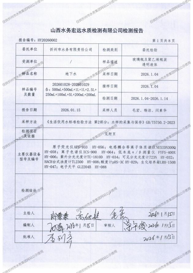 忻州城區(qū)公共供水水源水、出廠水、管網(wǎng)水、管網(wǎng)末梢水2026年1月份水質(zhì)信息公示