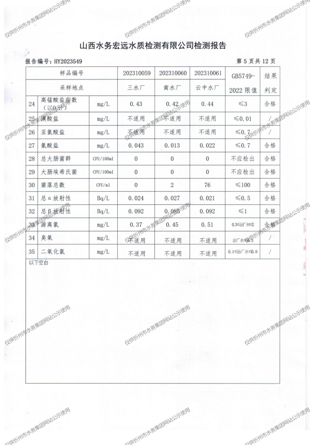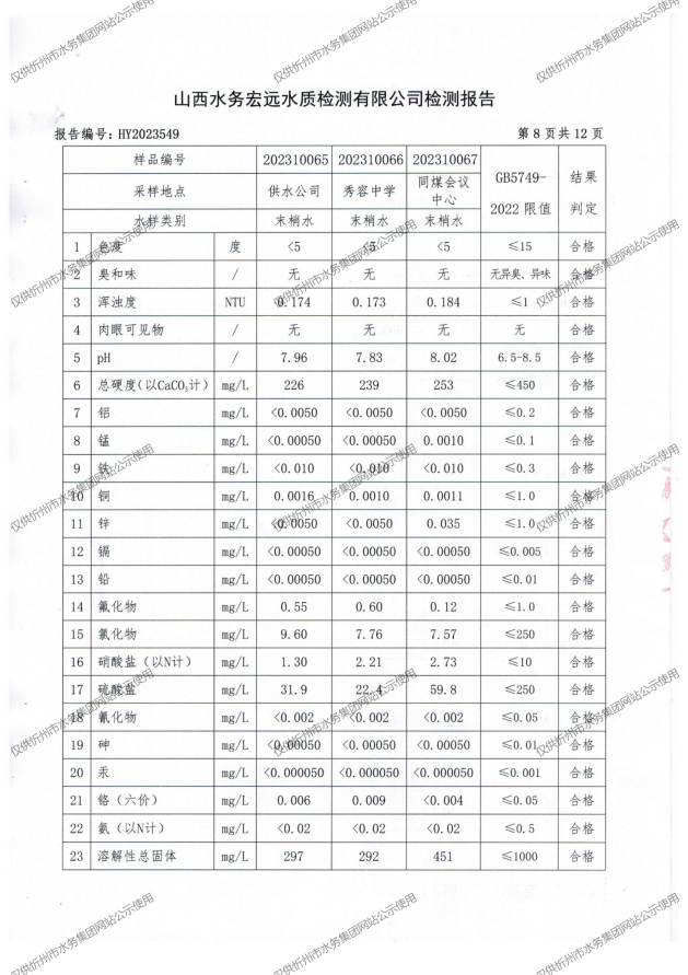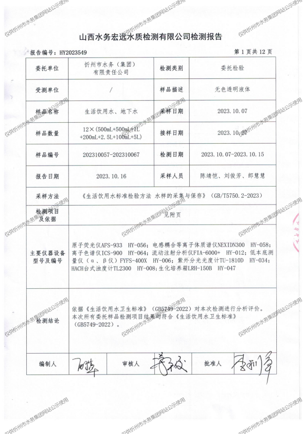 忻州城區(qū)公共供水水源水、出廠水、管網(wǎng)水、管網(wǎng)末梢水2023年10月份水質(zhì)信息公示