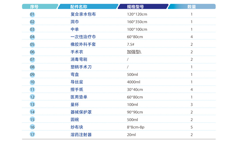 適用于介入手術(shù),產(chǎn)品主要由高性能無紡布制成的包布、洞巾、一次性治療巾、醫(yī)用墊和導(dǎo)絲盆、量杯、彎盤、器械保護(hù)罩等配件組合而成,可根據(jù)臨床需要更改介入包內(nèi)配件數(shù)量,增加開洞數(shù)量、配備具有更高防護(hù)等級的吸液層,強化手術(shù)關(guān)鍵區(qū)域的阻隔能力。