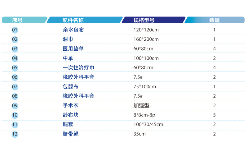 適用于婦產(chǎn)科手術(shù),產(chǎn)品主要由高性能無紡布制成的包布、醫(yī)用墊、手術(shù)衣和腿套、外科手套等配件組合而成,可根據(jù)臨床需要更改產(chǎn)包內(nèi)配件數(shù)量或配備嬰兒巾、臍帶繩等配件。
